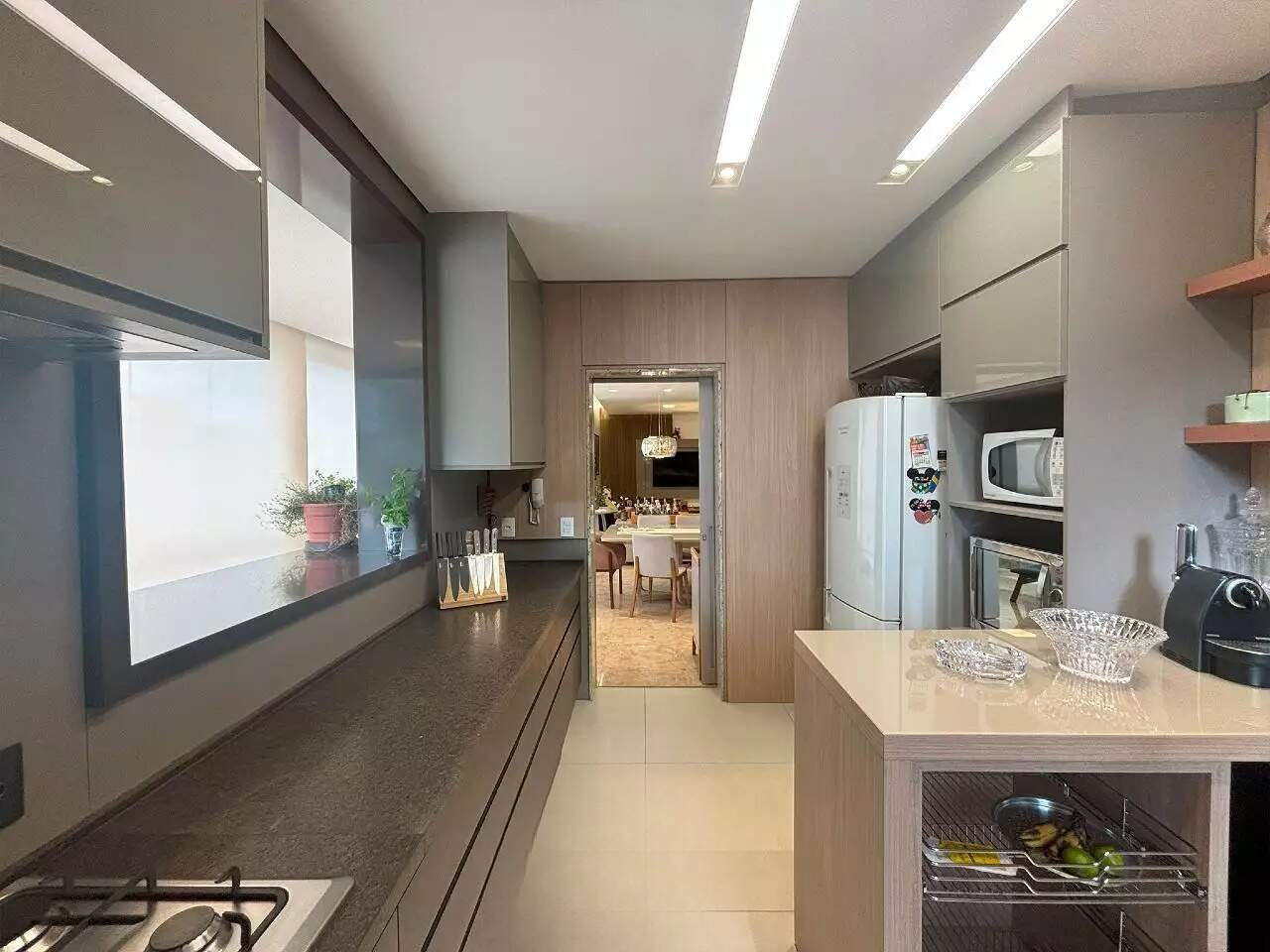 A cozinha é americana e planejada, com bancadas em granito e área de serviço.