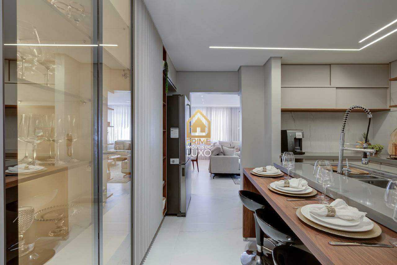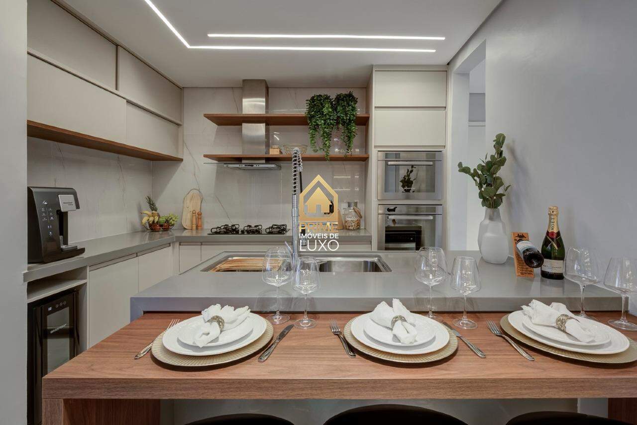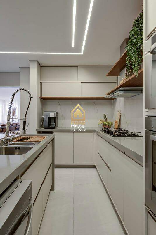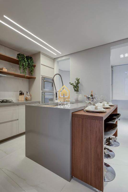 Cozinha contemporânea com ilha planejada e excelentes armários, além de área de serviço funcional.