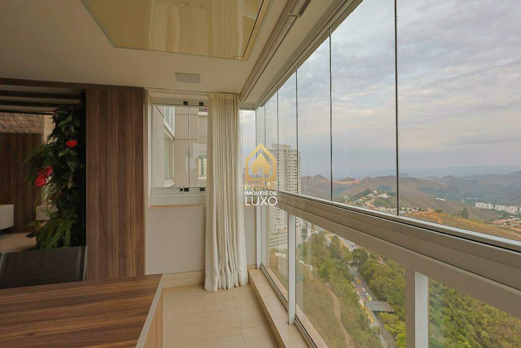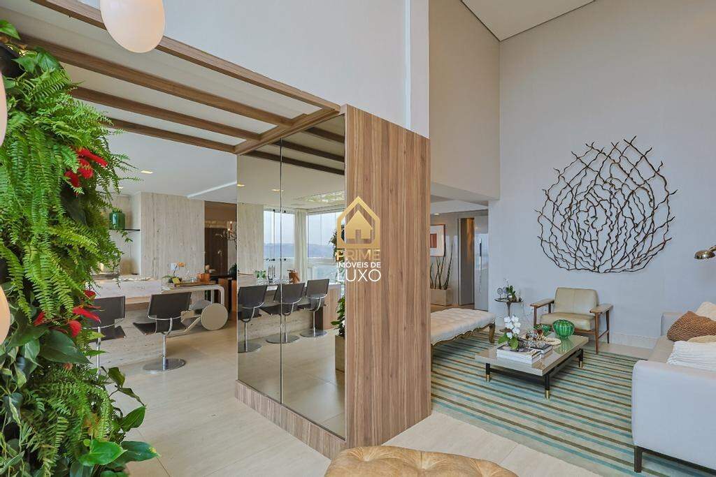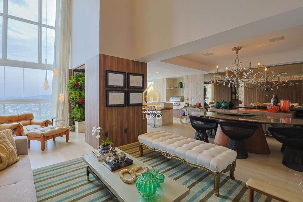 Sala de estar com pé-direito duplo, varanda gourmet, andar alto com vista panorâmica.