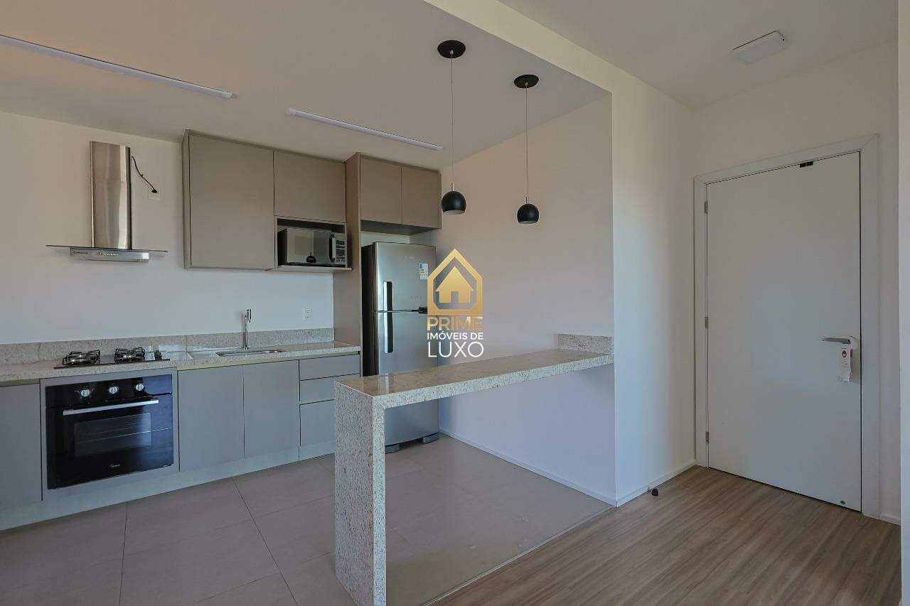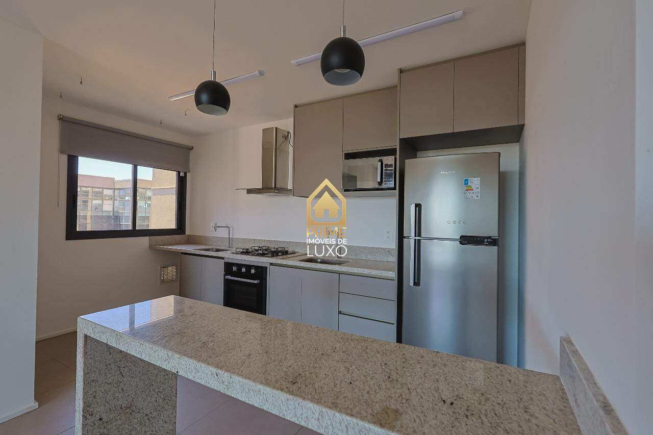Cozinha integrada e equipada com geladeira, microondas, cooktop, e forno.