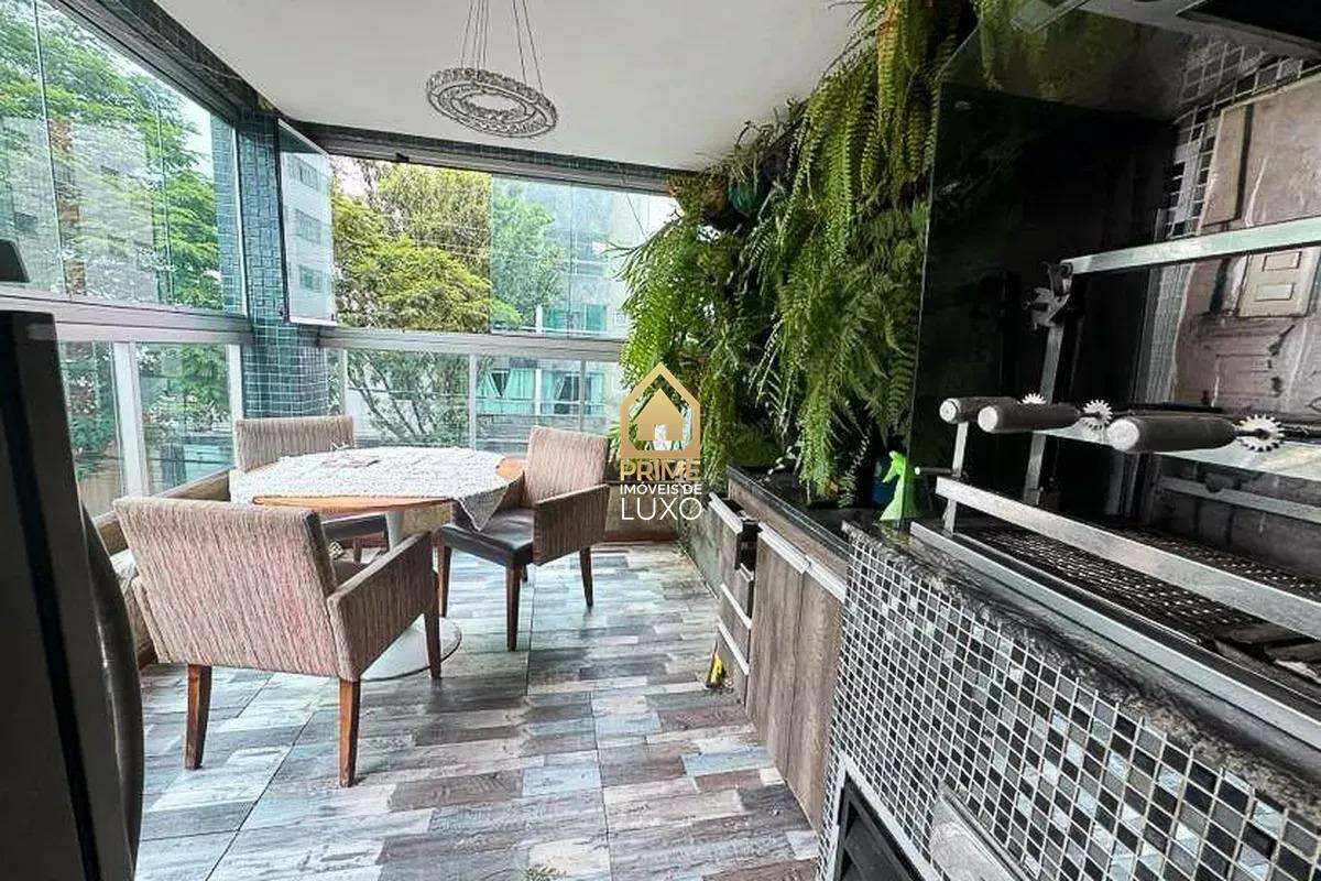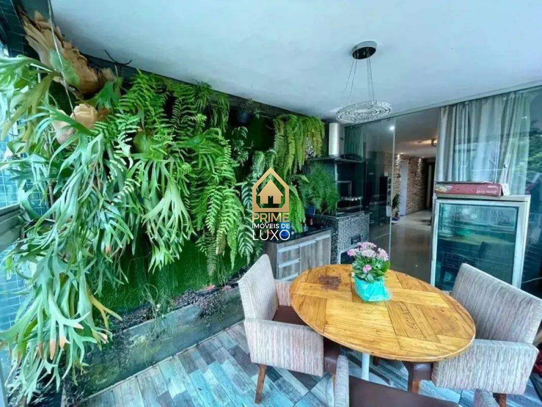 Varanda gourmet com churrasqueira, pia, e mesa;