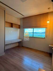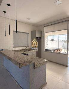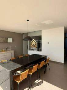 A cozinha conta com bancada em granito e conceito aberto. A sala é ampla, com pé direito alto, painel e iluminação diferenciada.