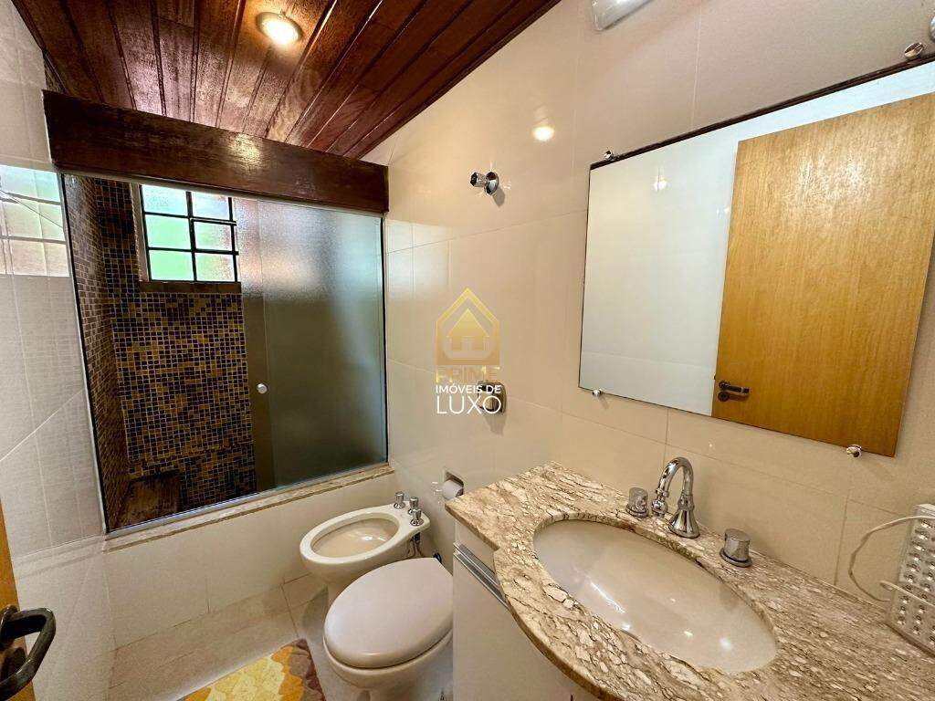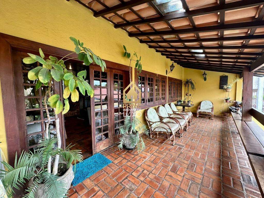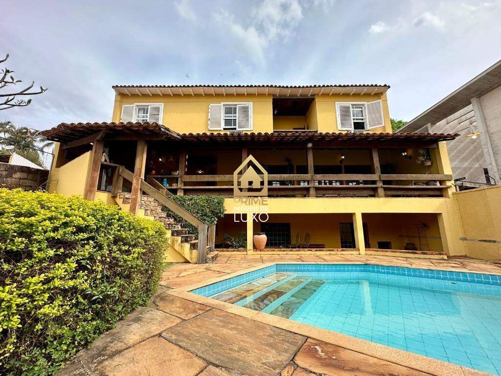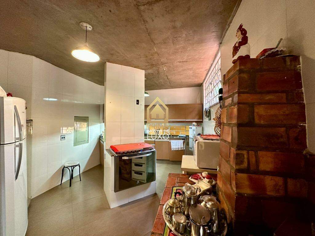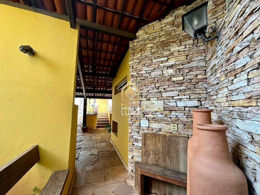 A casa possui 3 níveis e detalhes com pedras decorativas, janelas grandes de madeira, cômodos amplos e arejados.