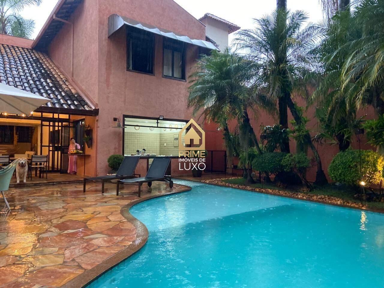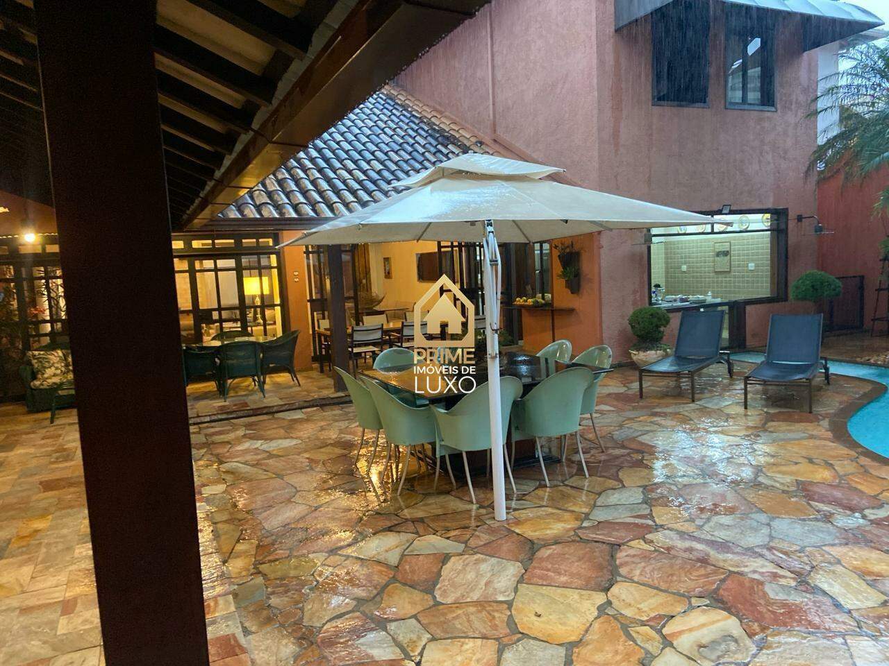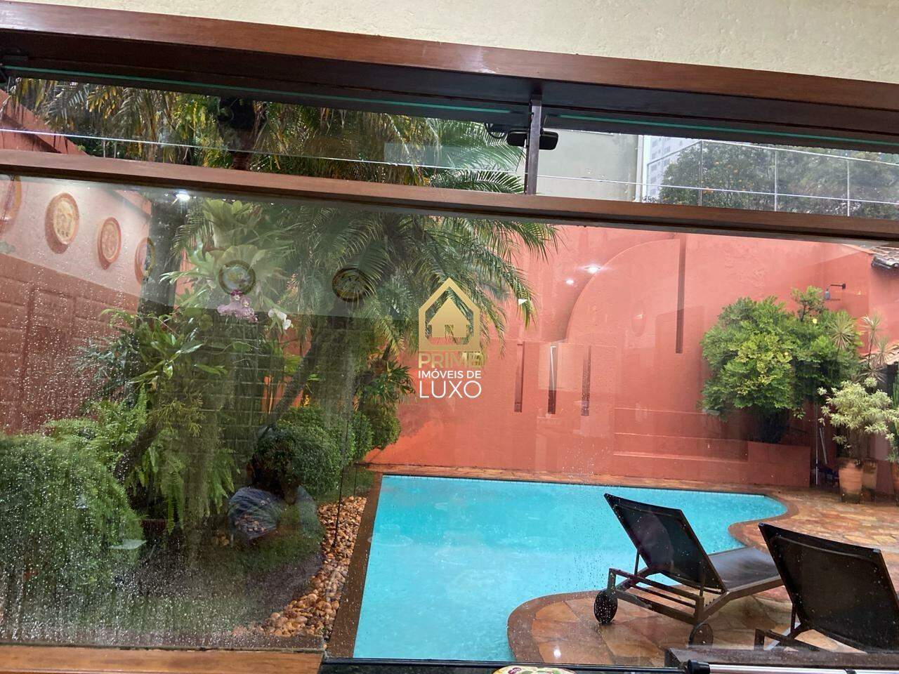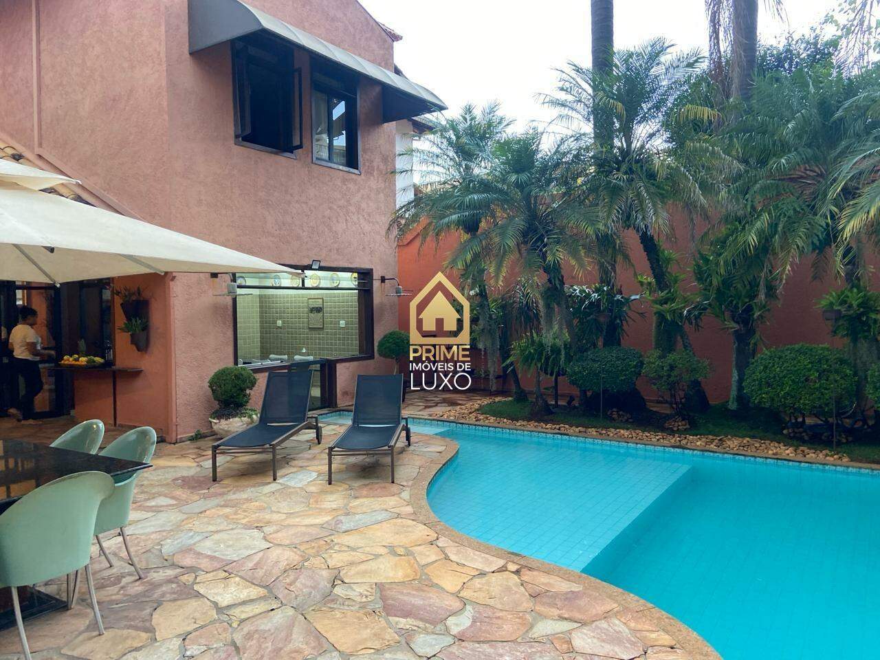 Área externa com espaço gourmet, piscina, sauna, banheiro, iluminação e jardinagem planejada.