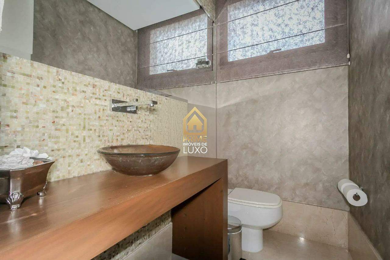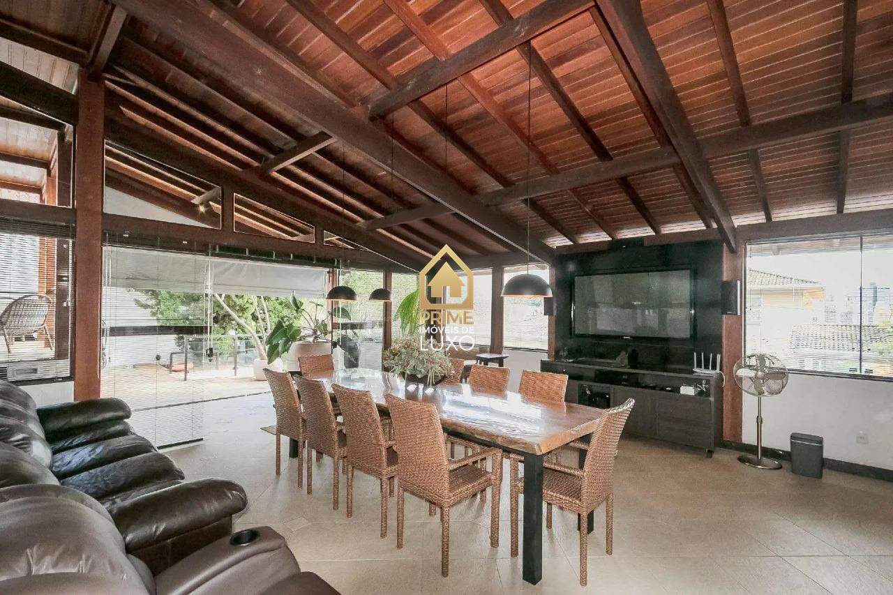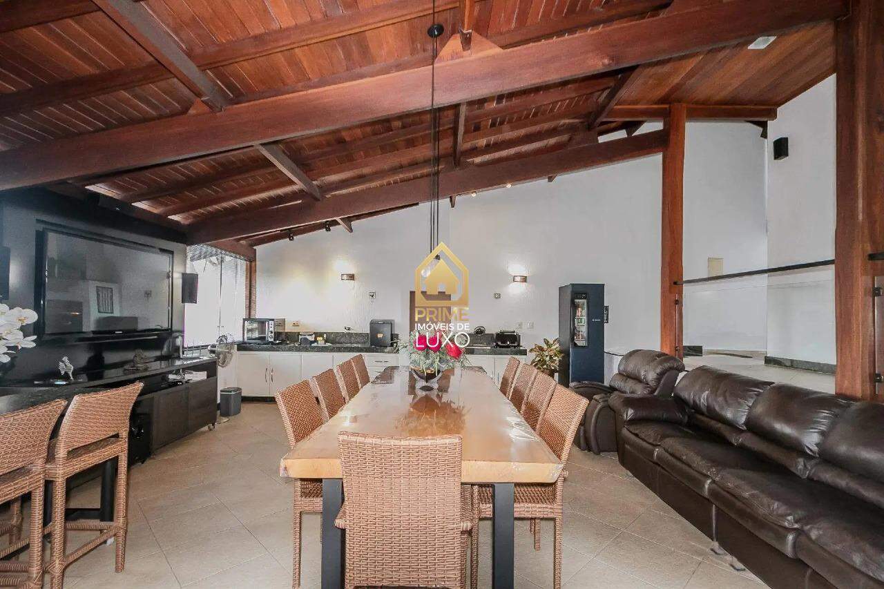 Com uma área construída de 335m², essa casa conta com 4 suítes, 6 banheiros, espaço gourmet com churrasqueira, lareira, sauna, AR condicionado, aquecimento solar, e uma piscina aquecida com cascata.