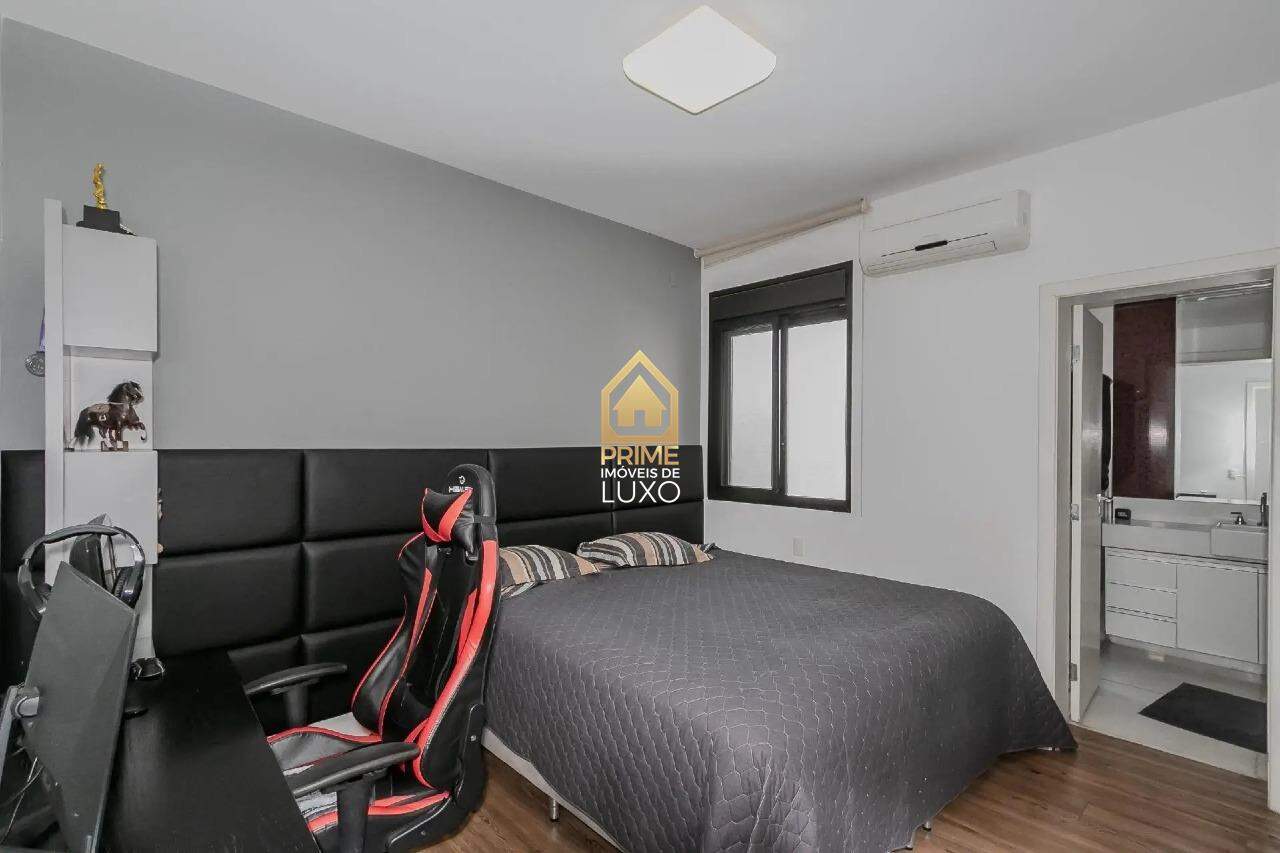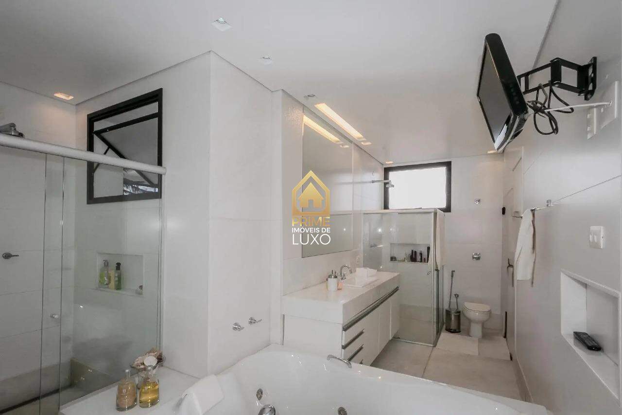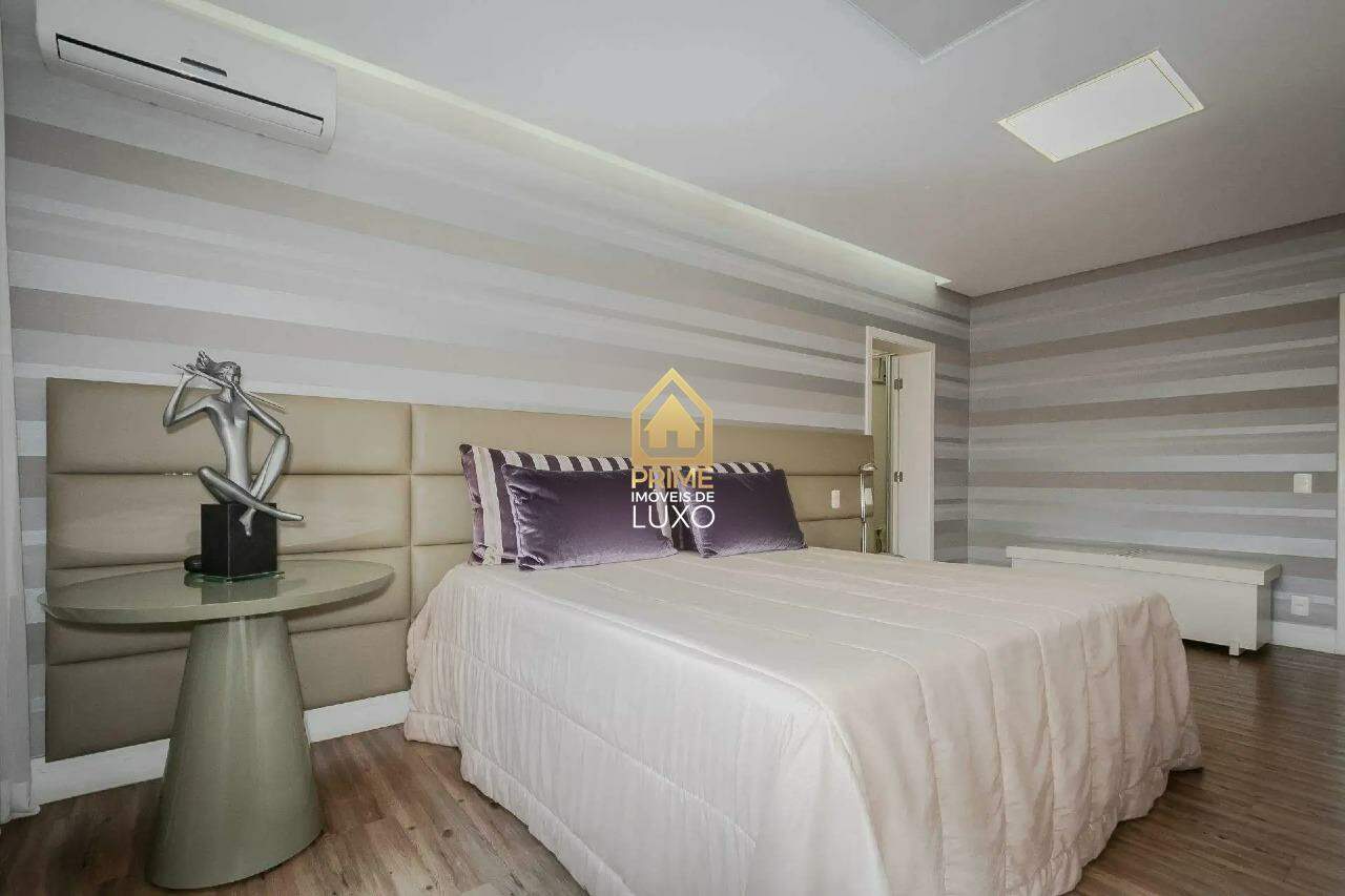 Com uma área construída de 335m², essa casa conta com 4 suítes, 6 banheiros, espaço gourmet com churrasqueira, lareira, sauna, AR condicionado, aquecimento solar, e uma piscina aquecida com cascata.