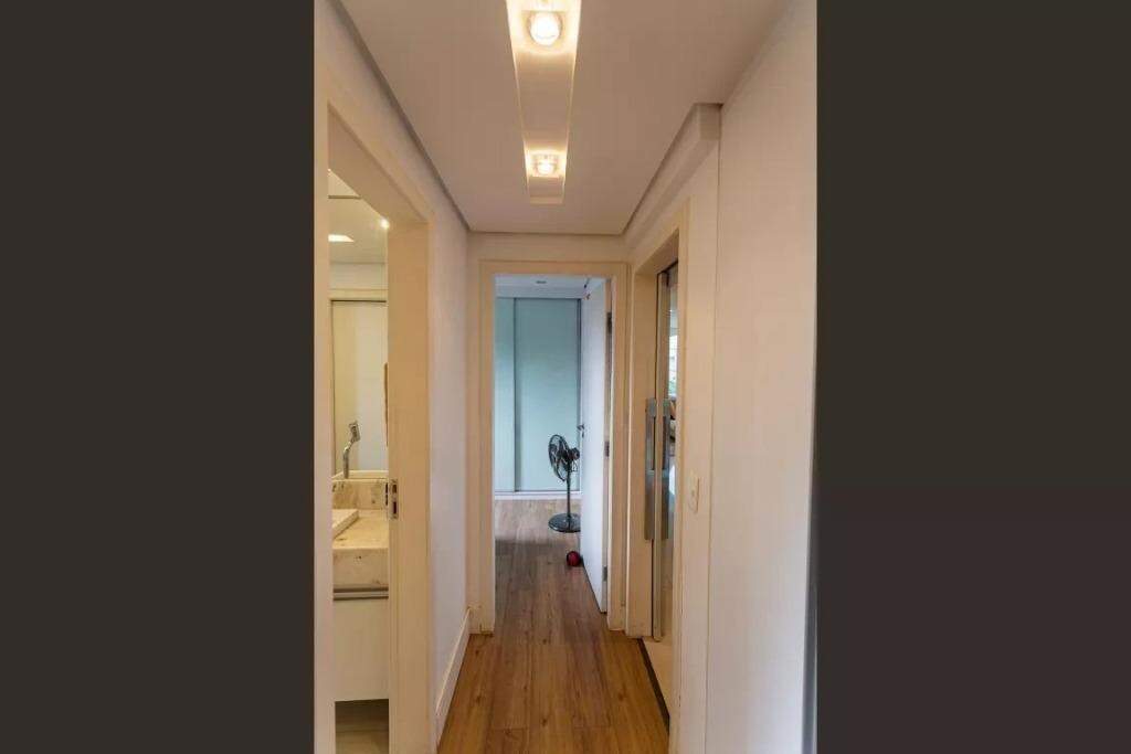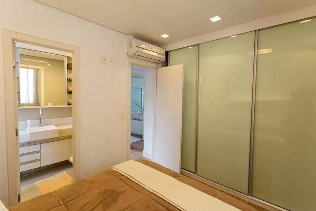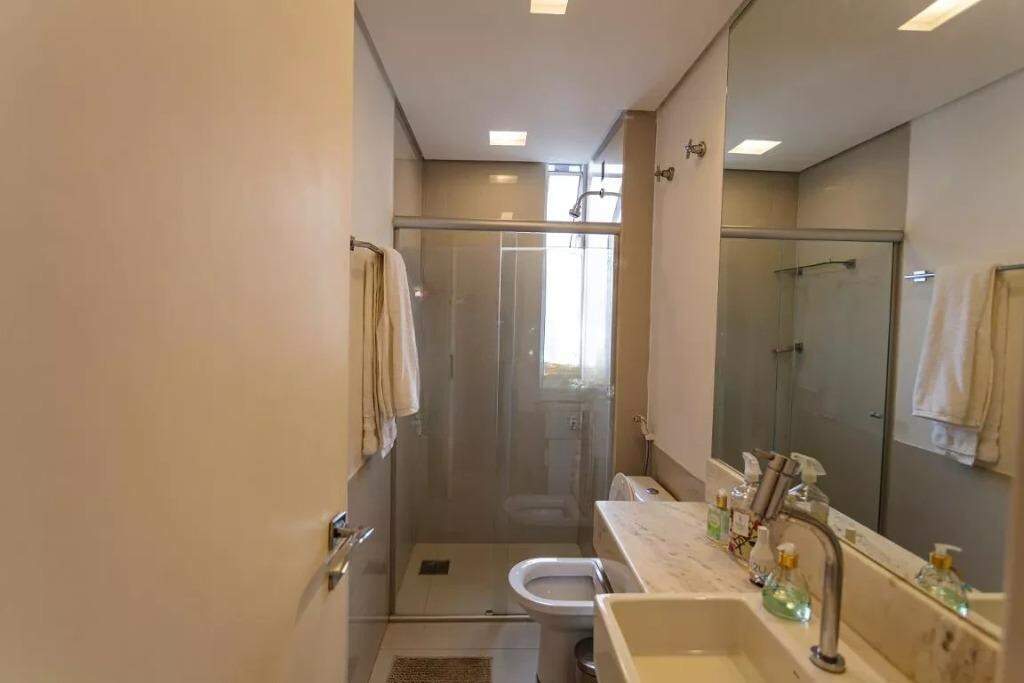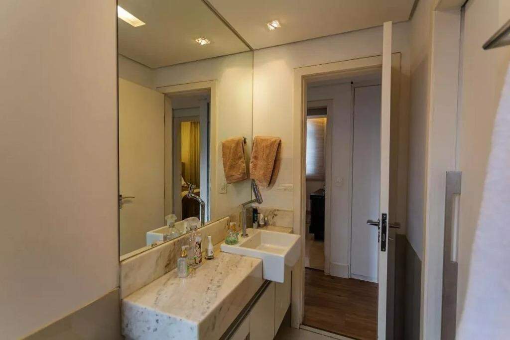 Banho social com piso em mármore, armário, espelho e box em vidro temperado